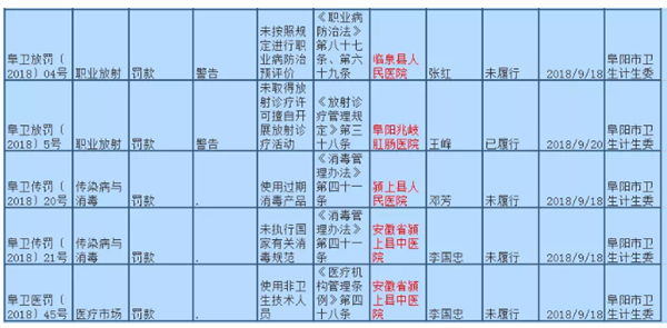 这次公布的卫生行政处罚案件,还涉及阜阳多家医院。处罚事由包括:使用过期消毒产品、使用非卫生技术人员、擅自开展放射诊疗活动等。