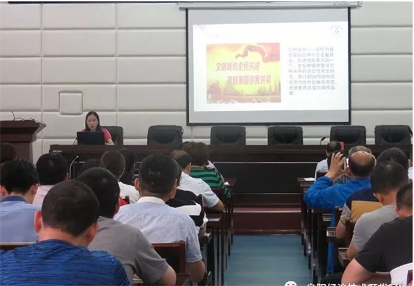 6月21日,阜阳市创建全国文明城市“六进”微宣讲巡讲团走进阜阳经济开发区“颍淮大讲堂·开发区分讲堂”,管委会全体工作人员聆听了宣讲。宣讲员王丽娜、米雪、喻文君、武剑从“高度统一思想,强化责任担当”“把